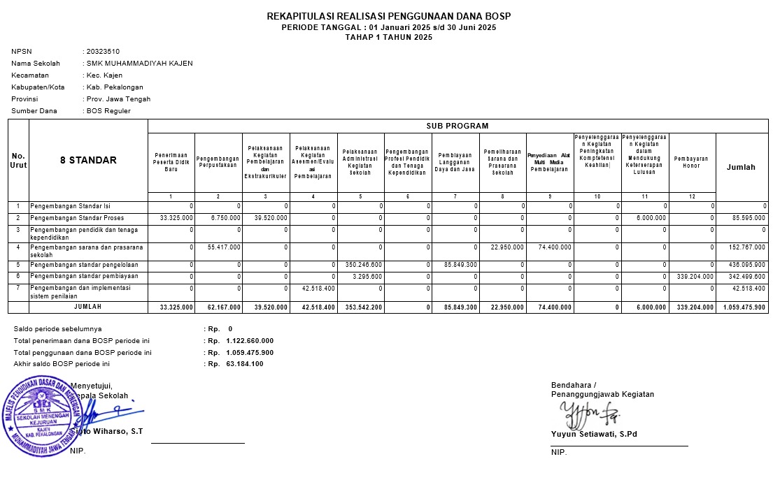 Rekap Realisasi Penggunaan Dana BOS Reguler Tahap I Tahun 2025